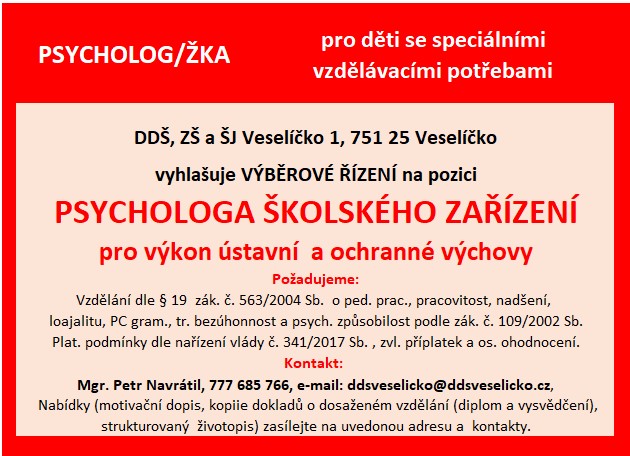 Střední škola logistiky a chemie v Olomouci (oblast Černovír) hledá na dočasný zástup školního psychologa či psycholožku, než se původní školní psycholožka vrátí z rodičovské. Škola má dlouholetou tradici spolupráce se školním psychologem, psycholog je zde pevnou a důležitou součástí ŠPP. Náplň práce tvoří především poradenská práce se studenty, konzultace s učiteli a vedením, řešení krizových situací ve škole, tvoření programu adaptačních kurzů a sociometrická měření ve třídách. Současný školní psycholog rád pomůže svému nástupci s uvedením do fungování školního psychologa v rámci ŠPP.