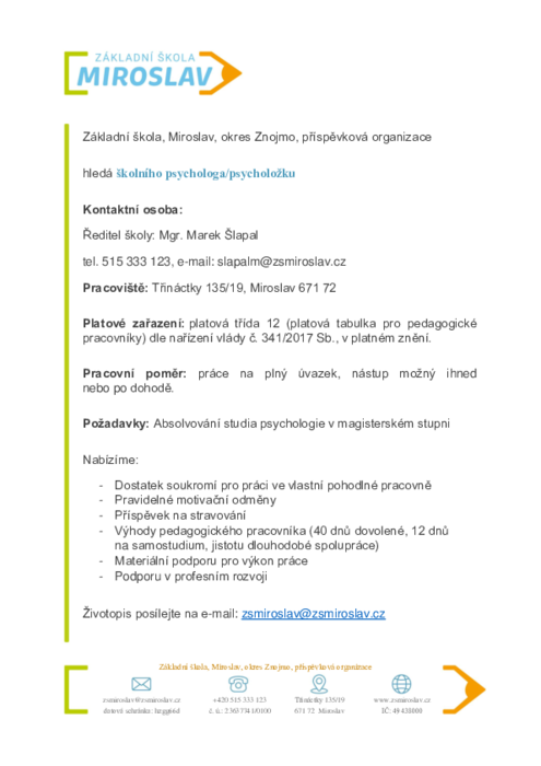ZŠ a MŠ Ostrava – Bělský Les, B. Dvorského 1, přijme od 1. 1. 2023 školního psychologa na celý úvazek. Pozice psychologa je ve škole zavedena, pedagogický sbor, žáci i rodiče žáků jsou zvyklí se na psychologa obracet. Je zde možnost jak individuální práce s žáky, tak práce s třídními kolektivy. Škola se nadstandardně věnuje také práci s nadanými žáky a spolupracuje s HC Vítkovicemi. Jde o fakultní školu Ostravské Univerzity. Ve škole je také skvěle fungující školní poradenské pracoviště. V případě zájmu zašlete svůj životopis na adresu milos.kosik@zsdvorskeho.eu
