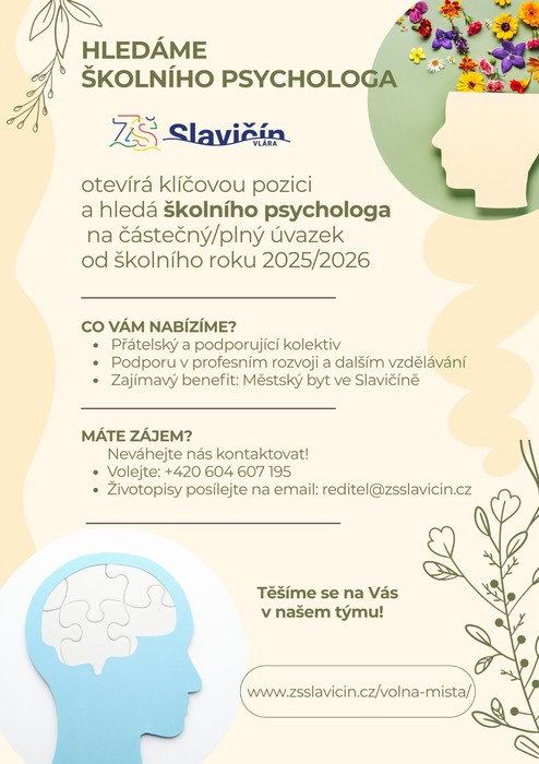 ZŠ Brodek u Přerova hledá školního psychologa/žku na úvazek 0,5 od 1. 9. 2025. Nabídky prosím zasílejte na e-mail: zs.brodek@volny.cz nebo volejte na číslo 728 121 399 nebo 581 741 140.