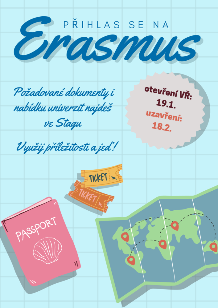 ráda bych Vás informovala o tom, že od 19. 1. 2026 se můžete přihlašovat do výběrového řízení na zahraniční mobility v rámci programu Erasmus+. Výběrové řízení končí 18. 2. 2026. Poté bude komise hodnotit všechny vámi nahrané dokumenty. Výsledky budou zveřejněny ve stagu přibližně do týdne od ukončení výběrového řízení.